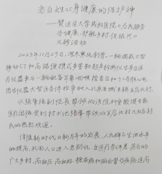 立冬已至,寒气来袭,随着秋冬季节的到来,心脑血管的发病率逐渐增加,为了进一步宣传健康理念,倡导健康、科学、文明的生活方式,增强老年人的自我保健意识。2023年11月29日—30日,延安大学咸阳医院联合礼泉县城关镇街道办、王店北村党支部、村委会在礼泉县城关镇王店北村共同举办为期两天的以“服务百姓健康行,助力乡村振兴”为主题的大型义诊活动。