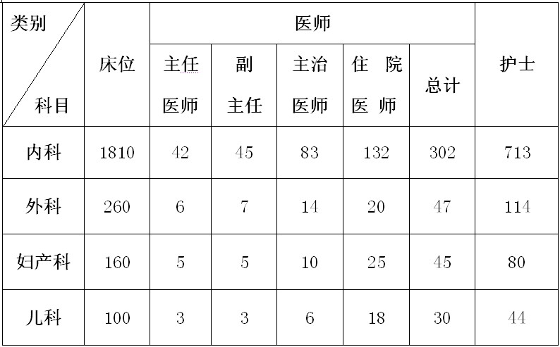 (2)新生儿科:设置床位40张,内含抢救室、ICU室,配备医师9名(主任医师1名,副主任医师1名、主治医师2名、医师5名),护士16名。
