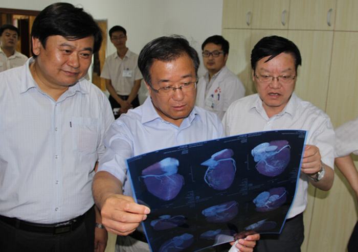 院长康彦文向崔校长一行介绍我院128排CT显影效果