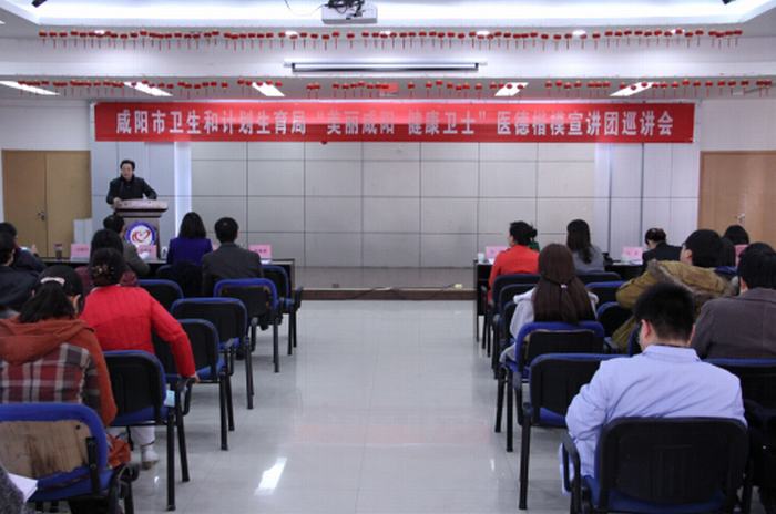 2015 年11月25日下午,咸阳市卫计局组织的“美丽咸阳 健康卫士”医德楷模宣讲活动在我院在综合楼四楼会议室举行。我院常务副院长张海涛主持了此次活动,参加此次活动的领导有咸阳市卫生计生局胡敏科长、樊红霞同志,宣讲团成员有咸阳市第一人民医院重症科主任—焦峰军、咸阳市中心医院传染病科主任—刘海玲、陕中二附院—周娜、彩虹医院新生儿科护士长—张茹、兴平市卫生局—范乐、淳化县卫生局—韩阳。