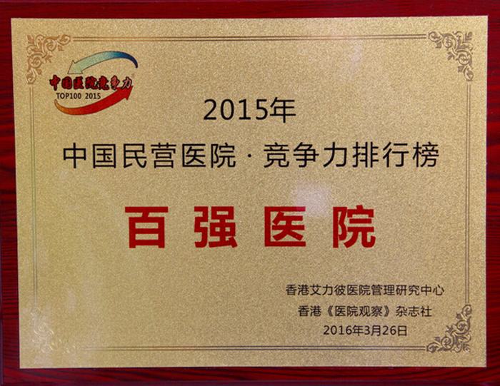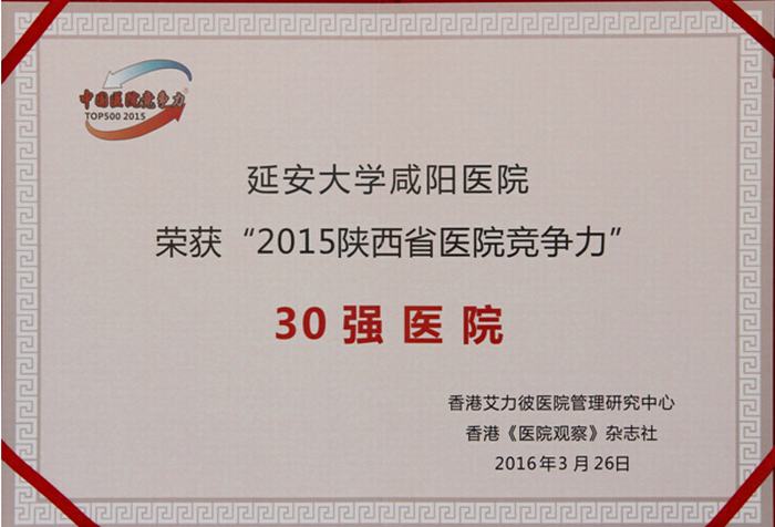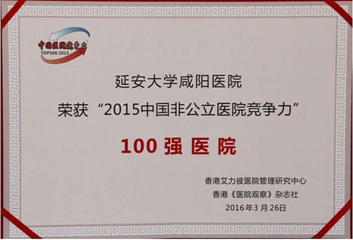 2016年3月26日,香港艾力彼医院管理研究中心发布了“2015中国非公立医院竞争力”100强医院,我院位列榜单第21名。同时发布了“2015年省域医院30强榜单”,我院位列陕西省医院30强榜单第27名。