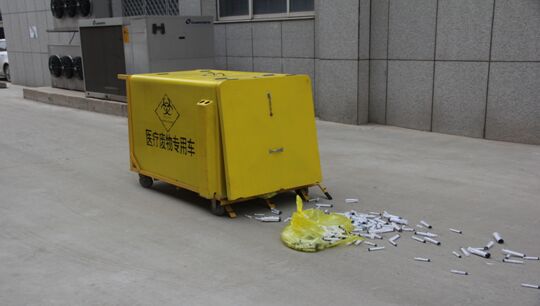 图2:医疗废物运送过程中,转运工具侧门关闭不严致医疗废物散落、暴露