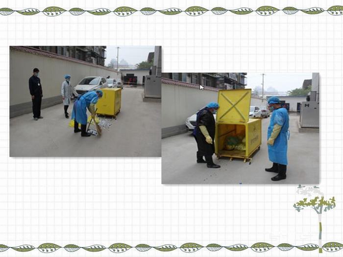 为增强保洁人员对医院医疗废物流失、泄露、扩散事件的应急处置能力,检验我院应对医疗废物流失、泄露、扩散等事件时的应急队伍行动能力、设备设施、消毒防护用品等方面的准备情况,通过演练发现不足及时调整补充,做好应急准备工作。演练模拟医疗废物转运人员在运送途中,由于转运工具侧门关闭不严,致医疗废物散落、暴露。医院感染控制办公室、保障部在接到事件报告后快速赶到现场,进行危险评估,确定意外事故的风险程度,及时向总指挥报告。同时设立隔离区,禁止行人及车辆穿过,避免污染物扩散,对人员造成伤害。其后,医院各部门协调配合,进行应急处理。