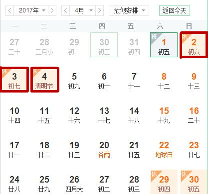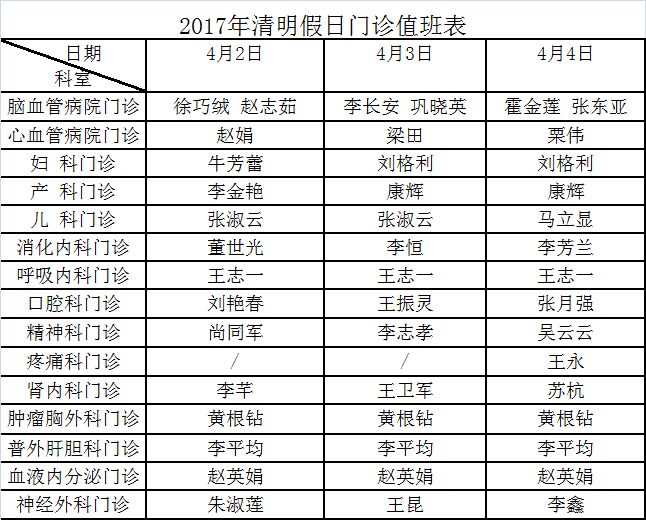 根据国务院办公厅《关于2017年部分节假日安排的通知》精神,结合我院具体情况,2017年清明放假时间定为:4月2日至4月4日休假,4月5日收假上班。