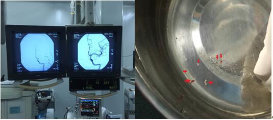为了让患者得到更有效、更安全的治疗,在与患者家属沟通后决定急诊行全脑血管造影术+机械取栓术。刻不容缓患者被第一时间送入导管室,迅速完成了DSA血管造影,证实左侧大脑中动脉M1段起始闭塞, 在神经外科知名教授专家姚晓峰副院长带领下,王伟伟副主任和宋波主治医师协助下成功完成手术,取出栓子,复查造影显示闭塞大脑中动脉完全开通,患者意识及右侧肢体活动明显好转,此时,距患者发病不到5个小时。