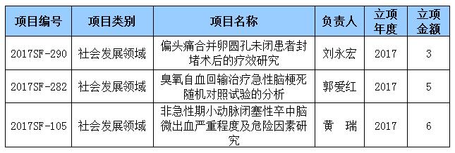 陕西省科技厅项目质量要求严格,项目级别仅次于国家自然科学基金。2016年中旬,医院共征集科技厅项目14项,所有项目经过初筛、材料会审、逐级审核、推荐及严密的专家评审,最终刘永宏副院长、郭爱红主任、黄瑞医师主持申报的《偏头痛合并卵圆孔未闭患者封堵术后的疗效研究》、《臭氧自血回输治疗急性脑梗死随机对照试验的分析》、《非急性期小动脉闭塞性卒中脑微出血严重程度及危险因素研究》3个项目脱颖而出。