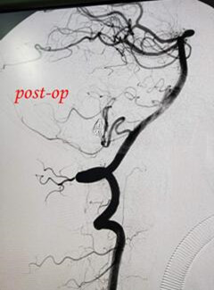 患者二:患者以“蛛网膜下腔出血”入院的病人,患者意识障碍严重,急诊行脑血管造影术:小脑后下动脉远端动脉瘤,经姚晓峰副院长仔细研究分析及阅片,制定手术方案,向患者家人充分告知病情危重,随时有生命危险,患者家人经商议后决定同意手术,急诊全麻行动脉瘤介入栓塞术,手术顺利,围手术期平稳,术后患者意识障碍明显好转。