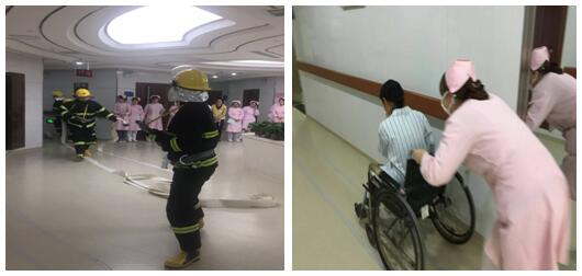 下午17:30护士常规巡视病房,走到三病室门口闻到一股浓浓的烟味,推开房门发现病房卫生间着火了,室内充满烟雾。立即招呼其他人员,“三病室卫生间着火了”,两名安全员提着干粉灭火器冲向病房,治疗护士随即关电关氧,按动手动报警,护士长赶到现场察看火势后立即指示:火势太大,立即请求保卫科给于支援,同时启动人员紧急疏散。通讯员立即拨通了33785222求救电话。由4名消防安全疏导人员带上湿毛巾,引导10名病人及家属用湿巾捂鼻,低身弯腰,向西侧消防通道楼梯撤离。在撤离过程中,病情重不能下床活动的患者由医务人员用轮椅推着,迅速撤离。同时,医院消防安全员赶赴现场,兵分二路开展扑救,一路手提灭火器冲入火场自救,一路快速连接消防水带灭火,火迅速被扑灭了。医务人员迅速将所有病人转移到安全地带之后,清点病人,确保全病房病人及医务人员均已安全撤离危险现场,并向护士长汇报。病人及家属积极配合,很认可此项演练!