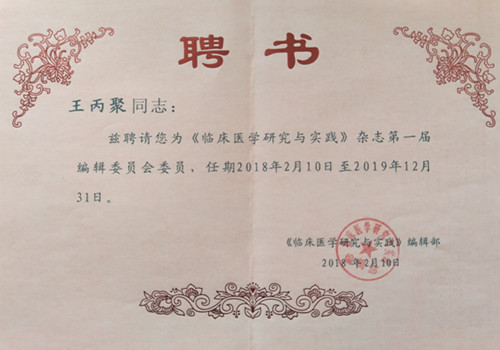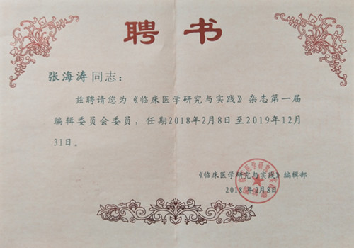 ——我院张海涛副院长、王丙聚副院长获聘为《临床医学研究与实践》杂志第一届编辑委员会委员