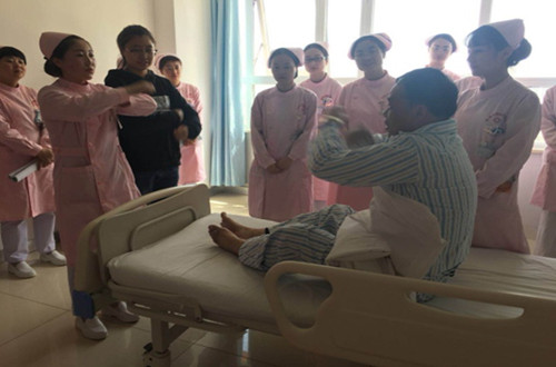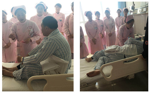 接下来在病房责任护士巨瑶对患者进行了规范的护理查体,并指导患者及家属分别进行了语言康复训练、吞咽康复训练、肢体功能训练以及良肢位的摆放。护士专业的手法、细心地讲解赢得了患者、家属以及现场护理人员的一致好评。康复指导结束,神经内科八病区全体护士针对早期康复相关专业知识以及脑卒中患者的心理护理展开了激烈的讨论。
