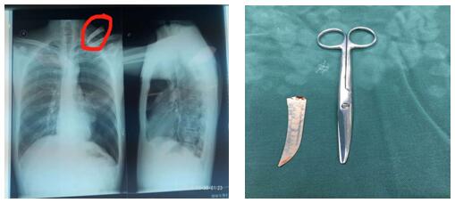 患者左颈根部可见一长约2cm伤口,边缘整齐,内插入刀片断端出血不止。左颈根部刀刺伤常常会损伤颈胸部大血管导致大出血危及生命、同时会造成开放性气胸危及生命,病情非常危急,需行急诊开胸探查术。苗主任与李伟主治医师、李仁栓主治医师立即制定了手术方案。1:40分患者被送进手术室,在全麻下行胸腔镜探查楔形切除、肋间血管缝合,胸壁伤口清创术。手术紧张有序地进行。凌晨4点钟患者安全返回病房,手术顺利完成。从患者颈部取出的刀片长约10cm 左右。