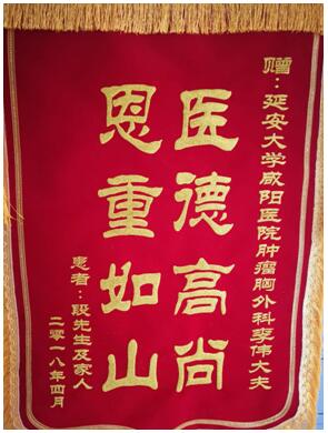 在肿瘤胸外科医护人员的悉心照顾和精心治疗下,患者已康复出院,为表达救命之恩,患者及家属特赠送一面书写着“恩重如山,医德高尚”的锦旗。