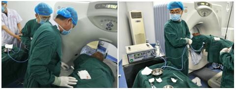 化疗后病人一般情况尚可,经过充分的术前检查及准备后,2018年6月26日在苗满园主任的带领下,与CT室联合进行手术,局麻后在CT引导下将电极针准确插入肿瘤内部,对肿瘤实施微波消融术。仅20分钟顺利完成手术,达到了预期的满意效果和消融范围。术中患者清醒无不适,术后6个小时患者即可下床活动。术后评估微波消融治疗范围,无出血及邻近脏器损伤。