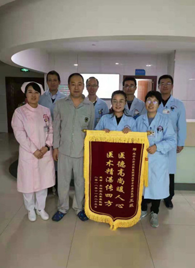 2018年11月14日05:20,夜班护士像往常一样紧张有序的忙碌着,急诊科送来一名男性患者,37岁,家住黑龙江,坐飞机途中发病,以“头晕伴恶心呕吐、全身乏困10小时”主诉入院,急查颅脑CT示:未见异常。于11月15日行头颅MRI,危机值提示:右侧小脑大面积脑梗死,病情急,科室主任来海欧及王飒主治医生为患者制定了详细的治疗方案,王宝艳护士长及时妥善安置患者家属。经过家属及医护人员的精心治疗与护理,患者病情好转,在出院时赠送医务人员一面锦旗。