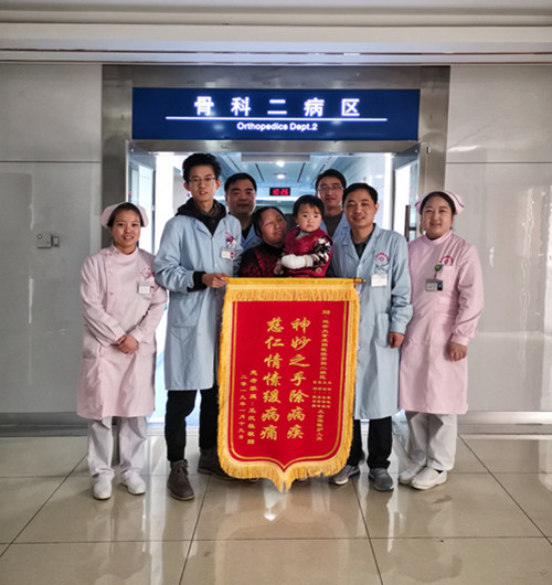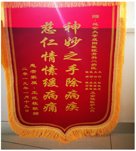 为表示感谢,患儿家属特赠侯晓进主任及骨科二病区全体医护人员锦旗一面。为2岁幼儿左示指末节再植创造了我院最小年龄断指再植。我院断指再植技术在咸阳地区处于领先水平。