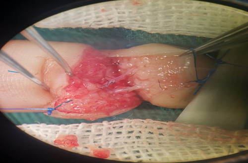 经科主任侯晓进主任组织,科内认真讨论,排除手术禁忌,急诊手术行断指再植术,保指治疗。患儿年龄较小,离断指体为末节,指体血管、神经细,手术难度高,风险较高。