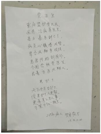 “重症监护贾医生,医疗治病真先生。亲力亲为到CT,……天下千万女护士,俊男护士人更敬”。患者一句简单的认可,彼此之间却吹过一股股温暖的春风,沁人心脾!