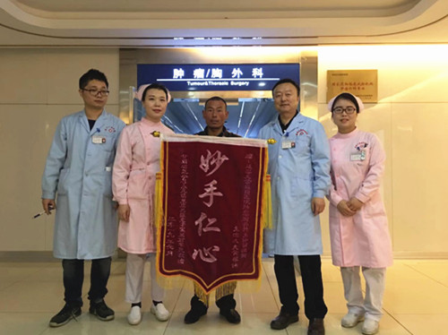 甘肃患者石某,61岁。因咳嗽,咳痰,呼吸困难在当地医院治疗效果不佳,病情加重,慕名前来我院诊治。以肺部感染肺脓肿并脓胸收住肿瘤胸外科。患者入住时口唇发绀、呼吸困难,气促,咳大量黄色粘痰,高烧达39.5℃,心率快,氧饱和度低,已出现感染性休克表现,随时都有生命危险。苗满园主任立即组织紧急抢救,迅速确立“双引流双循环冲洗新术式胸腔闭式引流”的治疗方案,即行急诊手术。术后护理团队在护士长的带领下对病情进行充分评估,除胸腔引流常规护理之外,还指导患者坚持做“呼吸功能训练操”进行康复锻炼,患者快速痊愈,顺利出院。并送“妙手仁心”的锦旗表达感激之情。