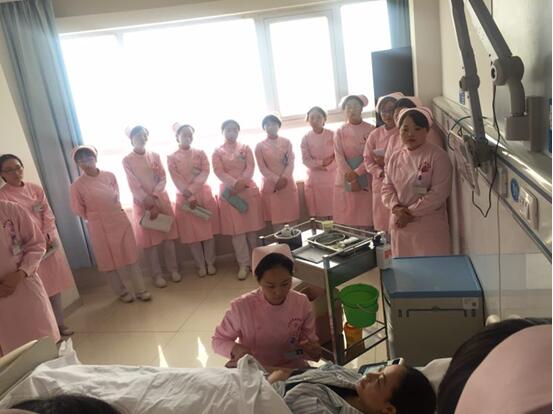 首先宋春兰总护士长介绍了此次查房的目的及选题的理由,接着高佩佩护士长代表全科护士感谢大家的观摩指导。随后,查房活动在科室护理团队激情洋溢的自我介绍中拉开序幕。主查护士李芳芳汇报查房病例,并提出患者目前存在的护理问题及采取的护理措施。之后部分人员随科室护理团队到病房观摩护理查体,整个查体过程规范有序、细致娴熟,充分体现了神经内科专科护士的专业水平和职业素养。查体结束后科室护理团队重点围绕脑卒中合并糖尿病患者如何进行血糖管理展开了细致而激烈的讨论。讨论结束后各科护士长对此次查房活动进行分组点评,各科骨干护士也发表了自己的看法。大家一致认为此次查房活动,准备充分,病史资料汇报详细,查体过程规范有序,特别对年轻护士在此次查房中的表现给予了充分肯定。