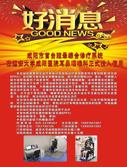 近日,耳鼻咽喉科护士长王小侠接到了昔日同事的电话,寒暄一阵后,同事说到自己妻子近期频繁眩晕,已经确诊为“耳石症”。但因妻子已怀孕八个月,到咸阳好几家医院去看,医生均表示手法复位风险太大,拒绝给予治疗,建议到西安大医院治疗。他无意间看到护士长的朋友圈,得知我院购置了咸阳市首台全自动化眩晕综合诊疗系统,立即打电话咨询预约。护士长打趣地说道“原来,醉翁之意不在酒啊”。