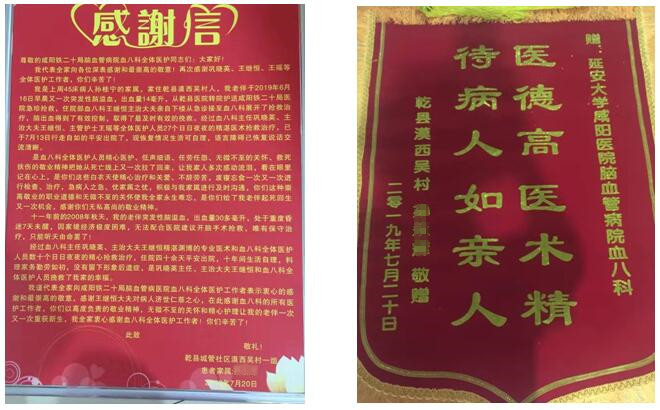 此时,外面传来了甚少听到的阵阵掌声与欢笑声,原来是我们已经康复出院的老病人携带她的女儿、老伴、孙子,怀里抱着的、手里提着的,肩上举着的是一面面锦旗,一封封感谢信,仿佛是在竭尽所有来向我们表示他们真诚的感谢。十一年前这位病人因为脑出血入住我科,经过全力治疗后康复出院,十一年后再发脑出血,入院后,巩小英主任及王继恒主管医生高度重视,制定了详尽合理的诊治方案。.......与此同时,医护人员间细心的沟通,以优质的服务让患者及家属树立了战胜疾病的信心,该患者的康复出院给了我们工作上莫大的肯定,让我们在工作上有了更大的干劲!