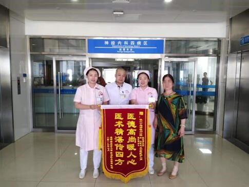 2019年7月23日,神经内科四病区的医护人员像往日一样紧张有序的忙碌着,突然一面绣有“医德高尚暖人心,医术精湛传四方”字样的锦旗映入了眼帘,送锦旗的是今日出院患者薛先生的家属。她满怀欣喜地特意将锦旗送到病区,感谢全体医护人员在他先生住院期间的精心治疗和热情服务。