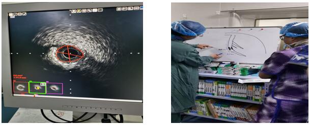 在无造影剂的对比下,是如何看清冠状动脉内部情况呢?专家讨论制定的方案是利用IVUS及FFR测量患者冠状动脉内病变及血流情况,在吴栋梁院长指导下、左梅主任多年丰富的介入手术经验亲临下,桡动脉穿刺、指引导管直达患者冠状动脉开口,从指引导管进入工作导丝,根据导丝形态判断血管走向及分布,判断好方向后,利用工作导丝进入IVUS超声导管,通过可以IVUS清楚的看到患者冠状动脉内部情况及病变位置,并详细记录,看完冠状动脉内部情况后,退出IVUS导管,并进入FFR导丝,通过FFR对IVUS看到的冠状动脉病变段的血流进行分析测量,从而判断患者是否需要支架植入治疗来减轻患者痛苦。