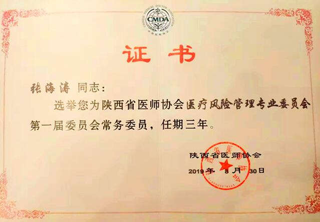 为贯彻落实党的十九大精神和健康中国战略决策部署,由陕西省医师协会主办,陕西省人民医院承办的“陕西省医师协会医疗风险管理专业委员会首届年会暨第二届西部医务管理高峰论坛”于2019年8月30日-31日在西安举办。我院张海涛院长带领医务部、质控办一行五人受邀参会,张海涛院长在30日下午举行的陕西省医师协会医疗风险管理专业委员会首届年会上,当选为第一届委员会常务委员。