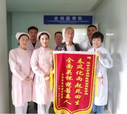 近日,患者石贵富的家属专程来到延安大学咸阳医院,将一面印有“春风化雨,起死回生,全面关怀,宛若亲人”的锦旗送到了全科医学科医护人员手中,感谢全科医学科医护人员在患者住院期间,精准的治疗和细心的护理。