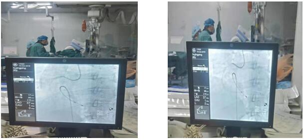 19点35分患者进入导管室手术间。手术医生迅速消毒、铺巾、行股静脉穿刺,植入临时起搏器以维持心率、肾上腺素维持血压;同时进行桡动脉穿刺,冠状动脉造影示右冠中段急性闭塞,血栓负荷较重……指引导丝通过,通过指引导管行冠状动脉内尿激酶原溶栓球囊扩张…… 20:10造影示右冠状TIMI分级为三级血流,生命体征平稳,手术顺利结束。