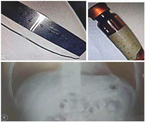 2019年10月22日,消化内科一病区科主任李恒副主任医师接诊了一位特殊病患,经详细询问相关病史,患者曾于近日不慎将一药瓶及钢丝吞下,反复腹痛,但尚可耐受。晨起患者突感腹痛剧烈,急诊行腹平片示:类似药瓶样异物潴留于胃中,而类似钢丝样异物已嵌顿至小肠近端。李恒副主任医师当机立断,凭借多年临床经验及精湛的内镜操作诊疗技术,认为首选内镜下异物取出术,创伤较小,但因为钢丝样异物嵌顿于小肠近端,位置较远,而且存在嵌入深度不明确,并发消化道出血、穿孔等风险较大,胃镜长度不足等棘手问题。与患者进行了详细的沟通,充分告知内镜下取异物的优点及与之面临的难度及风险。内镜下异物取出术,能明显减轻痛苦,降低医疗费用,同时避免了手术风险及术后并发症等一系列问题。最终,在征得患者本人同意后,立即通知内镜中心,准备急诊无痛胃镜探查。