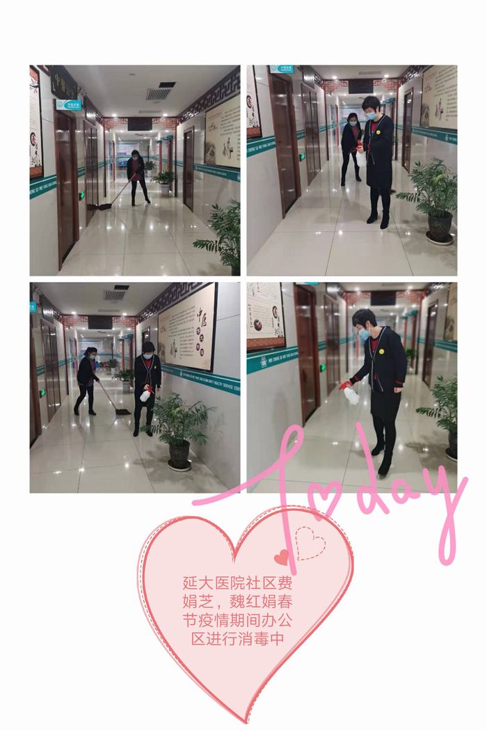 延大医院社区费娟芝,魏红娟春节疫情期间办公区进行消毒中。