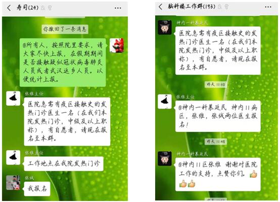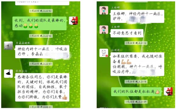 1月27日张维主任代表神内十一病区全科人员向院里电话申请支援一线,表明了我科全体员工随时听从医院统一调派的决心。