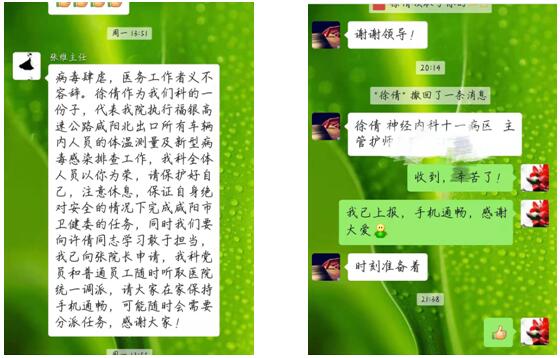 2020年1月25日陕西省启动突发公共卫生事件Ⅰ级应急响应,延安大学咸阳医院承担咸阳高速北口的排查任务。26日晚22:30分接到派遣任务后,徐倩同志10分钟到岗,服从医院安排,参加轮班。