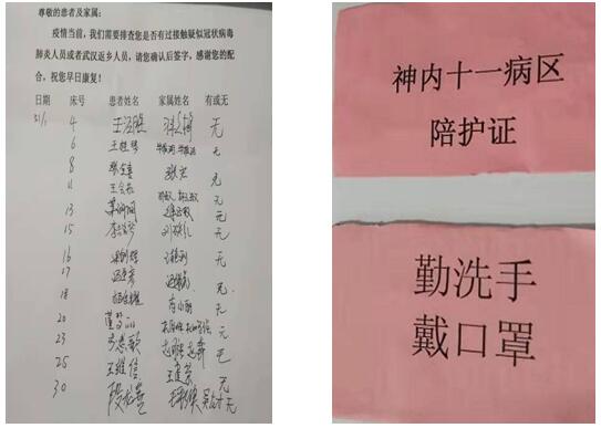 为了确保科室住院患者、家属及值班人员的安全和消毒落实情况,科主任张维和护士长屈少宁同志节假日期间,每日在科室工作群分享疫情防治情况,督导检查为了切实落实感控要求;王维娜护士制作了患者高温排查表及探视牌,由每日责任护士对所有在院家属测量体温确认正常后有家属签字;每位患者发放陪护证,每日三餐时间病区门禁系开放,家属持证出入。