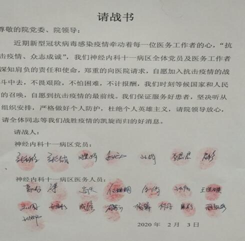 2020年2月3日收假第一天,工作人员到齐,大家纷纷表示要为抗疫做出力所能及的事情,在请战书上郑重签上自己的名字,并表示自愿加入抗疫队伍中,随时听候国家和人民调遣,服从医院的安排。