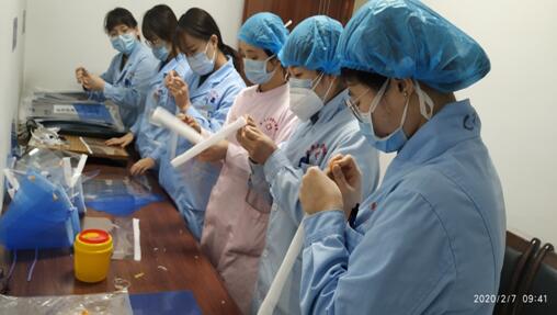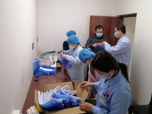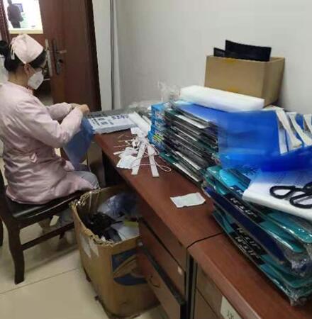 并肩相守,互帮互助,在一线,在后方,抗击疫情的人们留下了感人至深的身影。CT/MRI室护士王蓓蓓在看到科室窗口岗位及医院门口执勤同志防护物资不足后,主动抽出休假时间,放弃陪伴家人孩子,来到科室利用废弃的胶片、胶管、泡沫板制作出方便有效的防护面具,送给执勤同志试用后得到了良好反响。刘连锋院长助理兼医学影像科CT室主任在得知此情况后,给予了高度赞扬并立即号召全科室人员向王蓓蓓同志学习,在她带领下学习制作防护面具,医、技、护每组抽调二人共7人组成一个创作小团队,现学现做利用一个上午时间,五十副防护面具已经制作成功并送往行政楼医务部杨亮同志和人力资源部巨阿龙同志手中,他们负责送往咸阳北收费站及医院门口抗疫一线的执勤同志们手中,这小小的举动饱含着对奋斗在一线的同志们的平安希冀,也在传递着我们众志成城防控疫情的坚定决心,这个冬天的风将不再凛冽,总有一束光划破黑暗,加油,我们在一起!