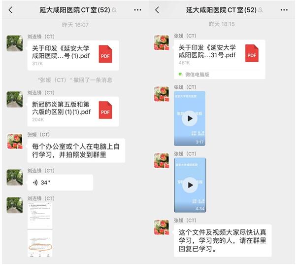 科室通过微信和企业微信发布我院各项通知及文件,带领大家多次学习新冠肺炎相关防控指南、诊疗方案和各省市最新有关新冠肺炎影像学的相关知识。2月19日,科室组织学习《新型冠状病毒感染的肺炎诊疗方案(试行第六版)》及“第五、六版差别比较”、《新型冠状病毒感染肺炎院感防控应急预案》和穿、脱防护用品流程的视频;2月20日下午4点整,刘连锋院长助理亲自主持召开全科会议,会议就近期我院成为咸阳市新冠肺定点收治医院形势下,部署科室疫情防控工作,并对近期存在问题进行梳理、优化,提出7点具体化、操作性强安排,并一一解读,对科室近一周来在防疫期间的工作流程和安排进行了重新梳理和优化,强调指出全科医、技、护在思想上要高度重视这次疫情防控工作的重要性,认真做好工作人员的防护工作,检查窗口要详细询问病史做好分流,就发热和/或咳嗽等呼吸道症状的病人检查前、操作时及检查后等影像检查流程、防护及感控进行详细安排;诊断报告要按照《湖南省医学会放射学会心胸组》 制定的结构化报告进行书写,同时要求对疑似病例进行AI系统识别,双二线审核,再经科主任会诊审核后发放报告;会议还强调全科人员要早晚测两次体温,同时上报各组组长,如有问题按照流程上报科室及医院;为减少人员之间聚集,优化班次。又详细解读《延安大学咸阳医院新型冠状肺炎病毒感染的肺炎医疗救治和防控工作(第二版)》和《新型冠状病毒感染的肺炎诊疗方案(试行第六版)》及“第五、六版差别比较”,全科会议结束后,医、技、护4个组又通过企业微信召开各小组会,召集值班人员、重点部位人员认真学习本次会议精神,并就各自岗位工作安排又进行了布置: