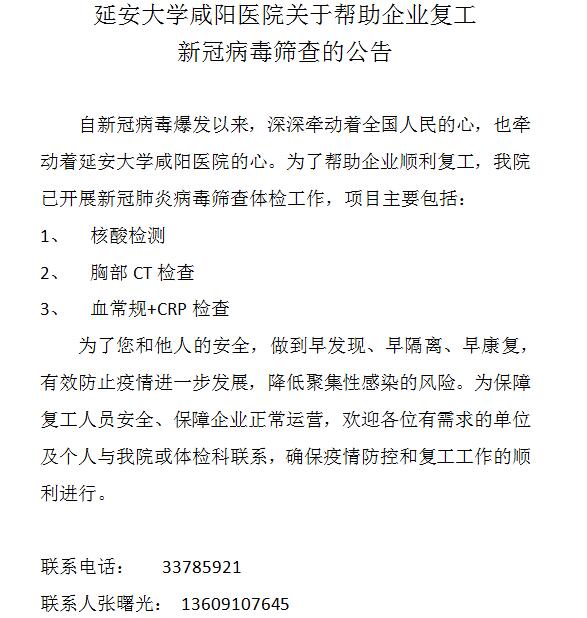 为此延安大学咸阳医院积极响应政府号召,为关于帮助企业复工新冠病毒筛查的工作做了充分准备,国家在抗疫,医护人员在抗疫,但最关键的是大众的自我防护,现在到了抗疫关键时期,为了不功亏一篑,延安大学咸阳医院强烈呼吁:不聚集、不聚会。胜利就在前方,打好抗疫最后一战!