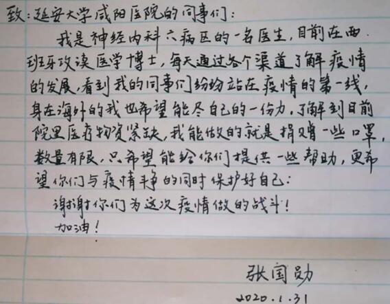 庚子新春,一场突如其来的新冠肺炎疫情防控阻击战在中华大地上骤然打响,无数医护人员走上前线同死神近距离搏斗,国内日渐严峻的疫情形势时刻牵动着海外学子的心。我院赴西班牙攻读博士学位医生张国勋,在得知医院防护物资严重短缺的情况下,组织同学们想方设法历经周折购买到1500个一次性外科口罩,第一时间寄回医院,支援身处抗疫一线的同事们,用实际行动守护着自己的美好家园。