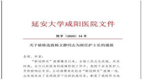 ——延安大学咸阳医院“火线”破格提拔超龄的杨文静同志为护士长