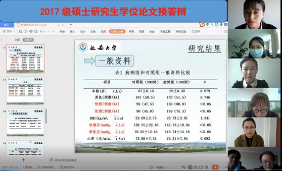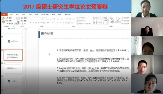 2017级研究生们通过屏幕共享和现场线上视频,利用PPT以图文并茂的形式围绕论文的选题目的与意义、国内外研究情况、研究方法和论文主要框架及结论等方面,对自己的毕业论文进行了全面详细的陈述。预答辩专家小组以严谨的学术态度仔细听取汇报、详查论文格式,围绕论文设计、方法资料、数据分析、结果展示、文献引用等方面进行了中肯细致的点评,指出了选用统计方法描述不够精准、论文格式欠规范、引用新文献比例不足等通病,针对每名研究生的论文进行针对性、启发式的提问。研究生们认真记录专家们的宝贵意见及建议,并能较为准确流畅地回答相关问题,现场学术气氛浓厚。
