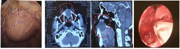 患者,男,59岁,因“发现口腔内肿物3月”入院,肿物累及鼻底,并导致鼻底严重隆起,经上颌骨CT三维重建检查,肿物大,且口内粘膜因肿物压迫已很菲薄,还合并肾病综合症,口服激素一年余。住院后张立刚主任组织术前讨论,认为患者如行传统经唇龈切口手术方式,极易导致伤口感染或不愈合,引起囗腔鼻腔漏,给患者带来灾难性后果。经查阅文献,结合自身坚实的鼻内镜技术基础,决定行经鼻内镜鼻底上颌骨囊肿摘除术。手术取鼻底小切口入路,切开黏膜后即见大量粘液溢出,清理后见口腔面黏膜菲薄,透光,与术前评估一致,遂将囊肿切除,等离子彻底止血,为防止压迫导致口腔鼻腔漏形成,摒弃传统的碘仿纱条压迫两周的观念,术腔仅填塞可吸收明胶海棉,避免因填塞导致术后剧烈头痛等不适。术后检查见鼻腔结构完整,口内包块明显缩小,鼻面部无任何不适。
