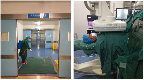 全科医护人员在完成日常介入手术配合之外,在做好患者及工作人员自身防护的基础上,为确保特殊时期医患更加安全,我们遵循预防新型冠状病毒的最新指南,严格执行手术规范。全科人员每日提前半小时到岗,对非限制区、限制区域及病员通道清洁、消毒3次;术前详细询问患者及陪人有无新型冠状病毒接触史、发热史;手术过程中层流系统不间断、每台手术后手术间彻底清洁消毒、全天手术结束后全体人员对科室所有区域再次进行彻底清洁消毒,确保第二天手术的顺利进行。