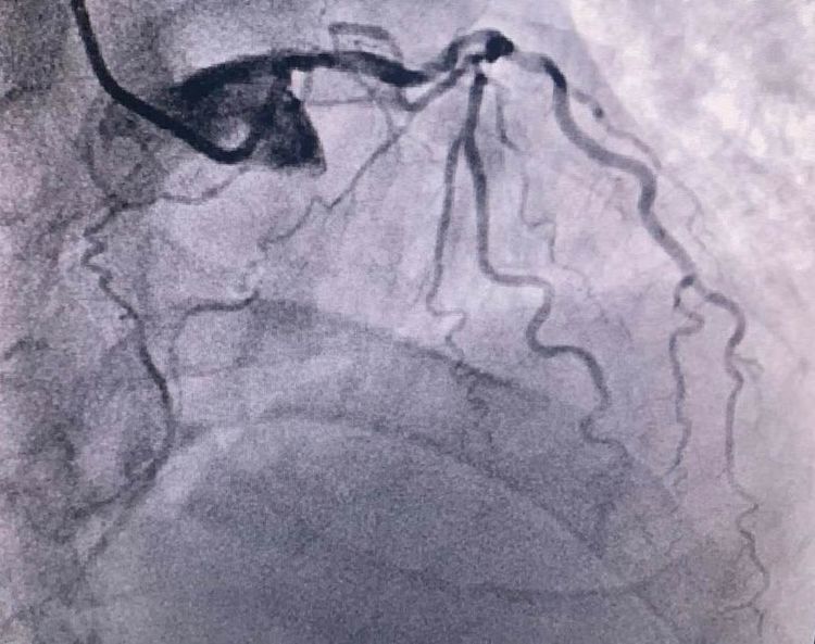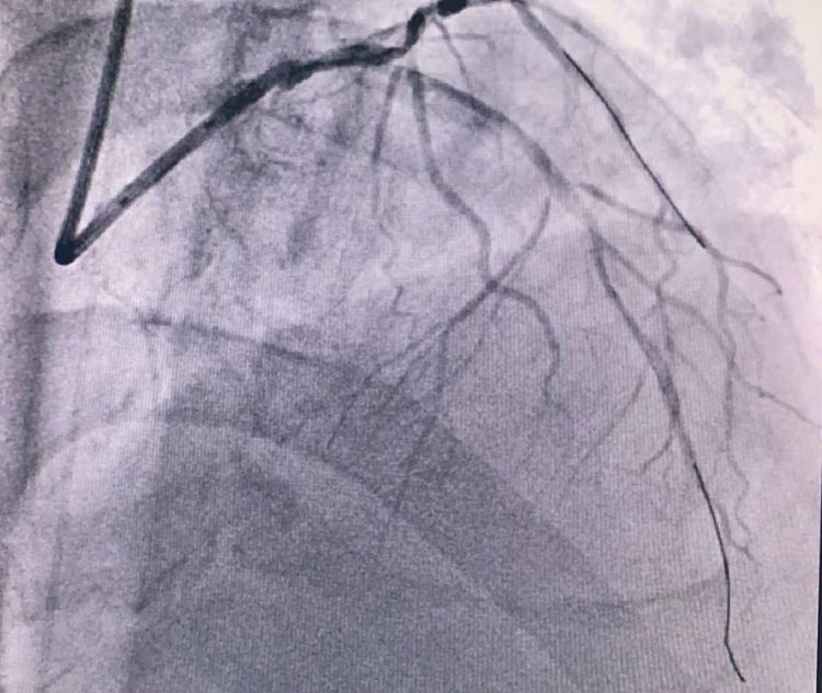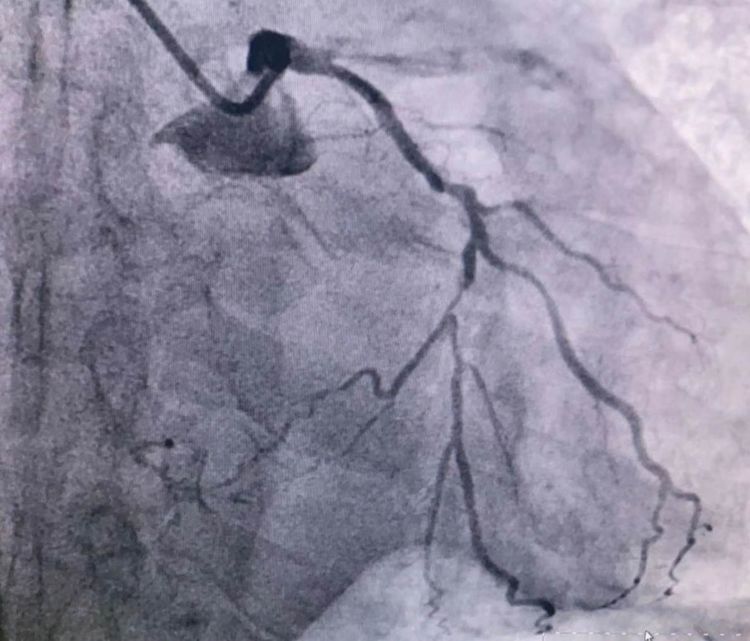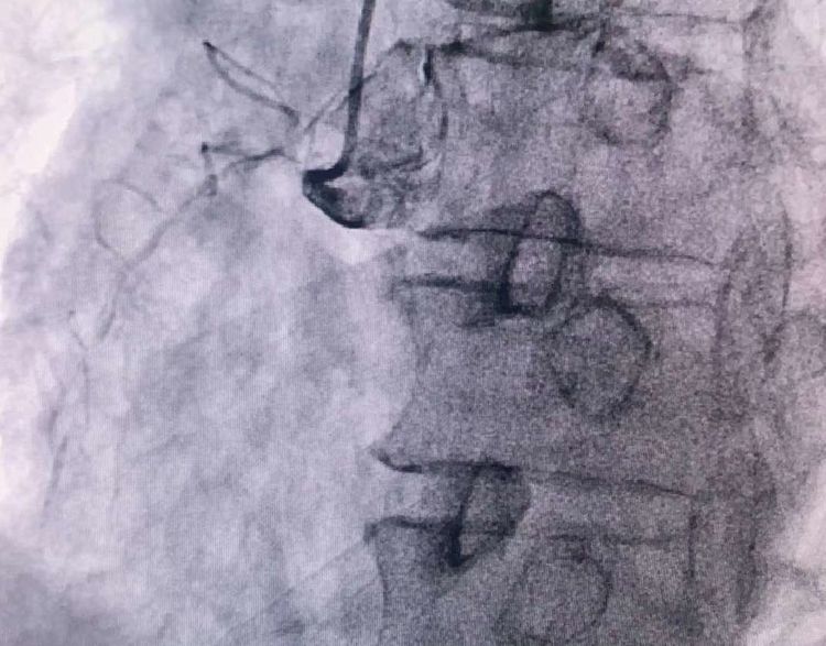 患者71岁高龄,外地医保患者。无高血压、糖尿病、吸烟病史。突发胸痛2小时急诊来院,病情就是命令。接到电话,立即启动我院的胸痛绿色通道,绕行CCU直达导管室。二线手术医生李妮妮责任总和冯韩章责任总,立即上台,给患者行冠脉造影。