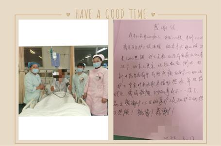 饭后,患者用微微颤抖的嗓音说:“你们让我觉得很温暖,看见你们的微笑,让我忘记了疼痛。”我想这句话是由衷而发的。颤抖的笔迹掩盖不住他想要表达的心声,他在表扬信中说道:“护士很温暖,比亲人更亲,所有感动的话语汇成了感谢、感谢、感谢!”