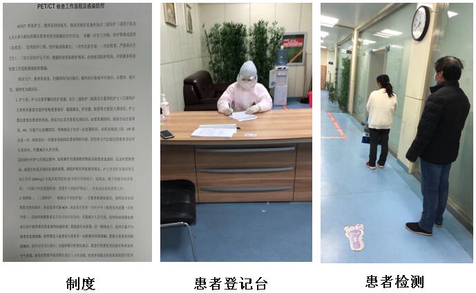 随着新冠肺炎到来,为了避免院内交叉感染,追求医务人员“零感染”的目标,根据医院要求,PET/CT室制定相关防护工作流程及感染防控策略。全科在核医学工作场所要求的三区(“控制区、监督区和非限制区”)划分的基础上,按照感控要求再次划分“污染区、半污染区及清洁区”。进出各区时遵守相应的感控及核医学工作场所相关要求。严格控制每日检查人数;在科室门口设立体温检测点,细心为患者测体温,用酒精为患者消毒并交代注意事项,登记患者信息及联系方式;设置独立问诊室,问诊医生实行佩戴护目镜、帽子、口罩等,实行单独问诊;护士因与患者近距离接触,实行二级以上防护,穿防护服、戴医用外科口罩、戴防护帽、护目镜并穿鞋套。候诊区患者实行一人一间病人,告知患者零交流;患者家属检查区以外等候,保持一定的距离。