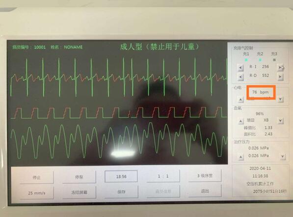 体外反搏在心脏的舒张期将双下肢及臀部的动脉血驱返至主动脉里面,这时主动脉内的压力(即舒张压)大大的增加,那么强大的压力使得无孔不入的血流在心脏的舒张期再次向外周供血,当血流到达肱动脉时被血压计检测到,故此就形成了脉搏是心率的两倍的效应。