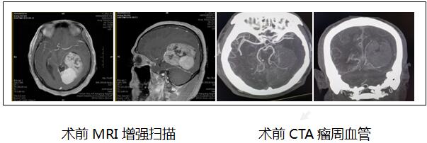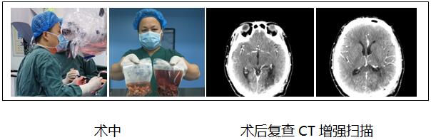 患者王某,男,49岁,因“头痛伴视物模糊2月”入院,头颅CT及核磁共振示左侧脑室后角及枕叶巨大肿瘤。头颅CTA及核磁共振增强扫描检查发现,肿瘤来源于脑内直窦和左侧脑室脉络膜,系不同来源质地不同的两个肿瘤叠加连体生长而成。直窦为脑内深部最重要的大静脉窦,脉络膜为脑室内重要结构,肿瘤与以上结构联结紧密,手术风险及难度都很大。考虑患者肿瘤巨大,周围大血管密集,与重要结构粘连严重,刘主任组织团队经过多次认真讨论后制定了详细的疾病诊治方案,预先分析了手术中可能存在的风险及处理方案。与家属反复沟通后。在刘增强主任、巨涛责任总医师、李鑫医师及手术麻醉科室的密切协作下,在全麻下实施显微镜下开颅肿瘤切除术。手术历时15小时顺利完成,成功切除全部肿瘤。术后一切正常,经重症医学科和神经外科一病区护理单元精心护理,患者无新增神经功能缺损,原有视物模糊明显好转,康复出院。