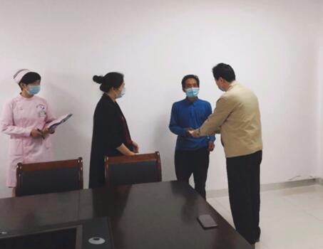 在第109个国际护士之际,我院护理部组织举办“让心靠近、将爱传递”手工义卖活动,将所得善款捐给家境困难的慢性病患者,当时我们第一时间就想到了这位患者,向院领导上报患者的实际情况,经院领导审核,最终确认将一部分款项捐赠给该名患者,当患者得知是将全院护士的手工作品进行义卖后,把善款捐给自己时,激动不已,儿子更是感激不尽,不知如何用语言表达感谢,连声说着:“谢谢,谢谢你们,谢谢医院的领导、科室医生和护士,感谢你们伸出援助关爱之手,我们一定坚强面对,争取早日康复!”